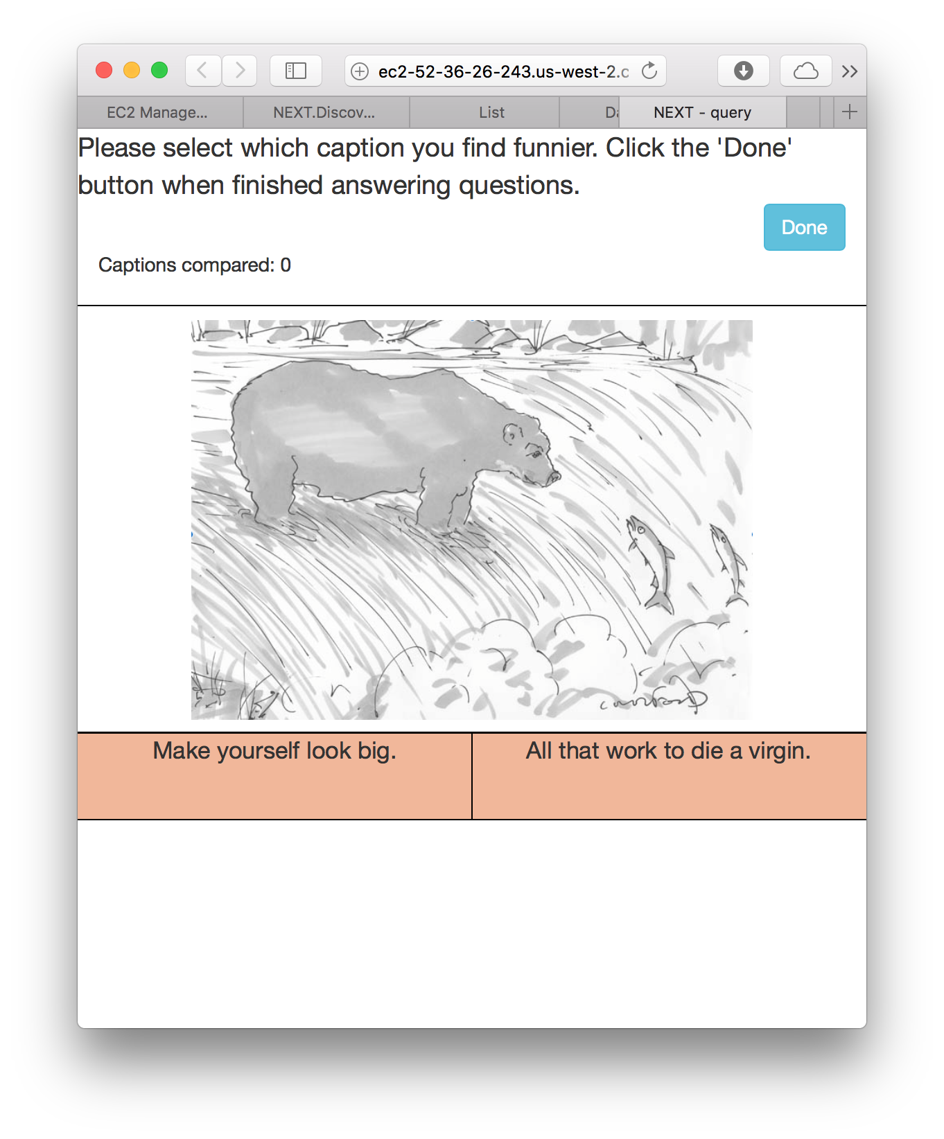 This repository contains data gathered on the NEXT active machine learning system for the New Yorker caption contest. The user sees a similar question to the one below and we provide information to the below questions/the answer/etc: