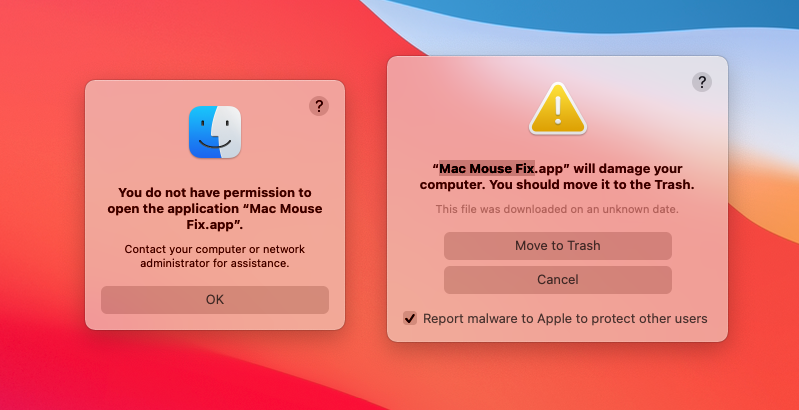 If you are already a Mac Mouse Fix user, you might have encountered messages saying that Mac Mouse Fix is malware when trying to open Mac Mouse Fix or after restarting your computer: