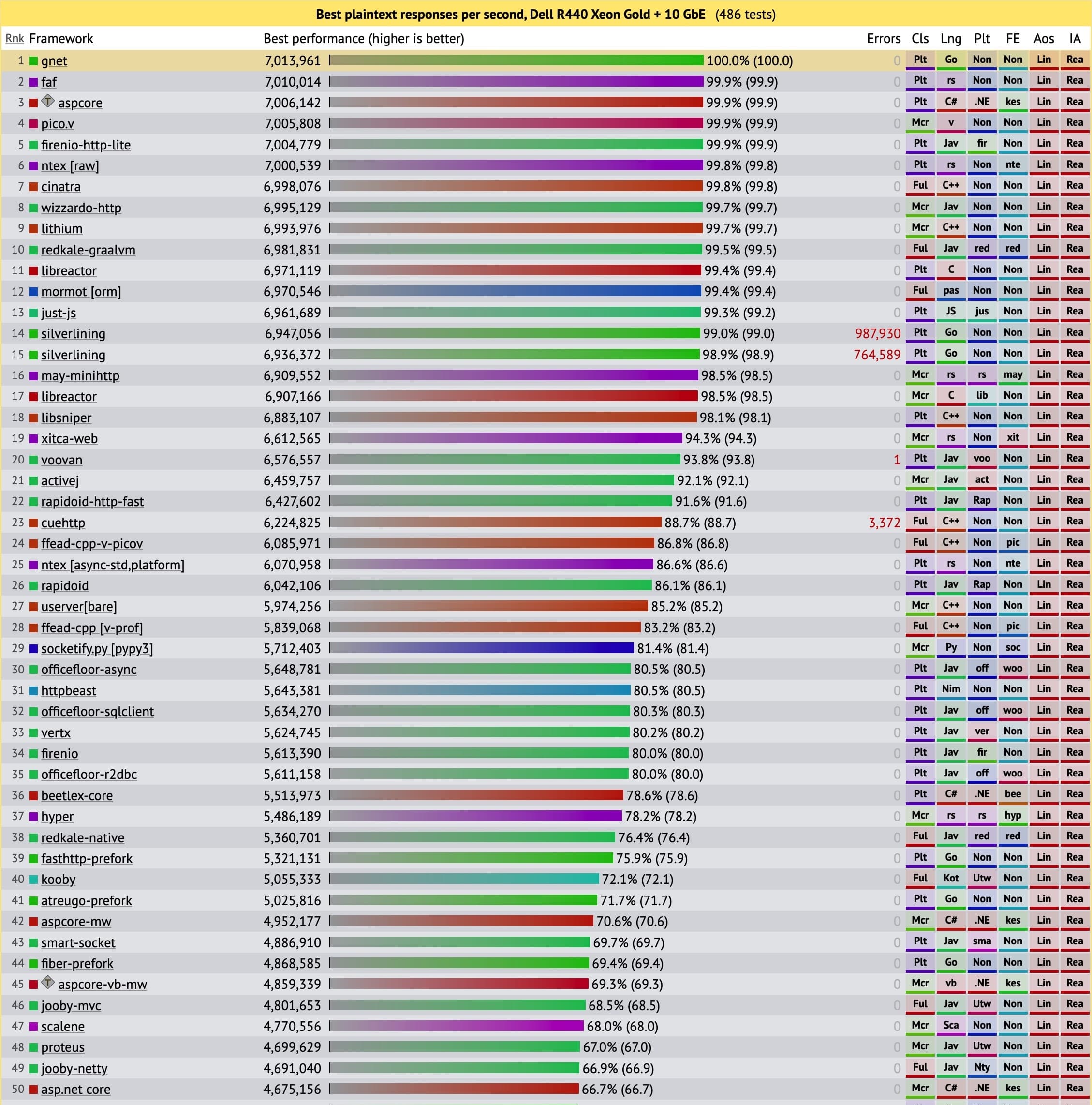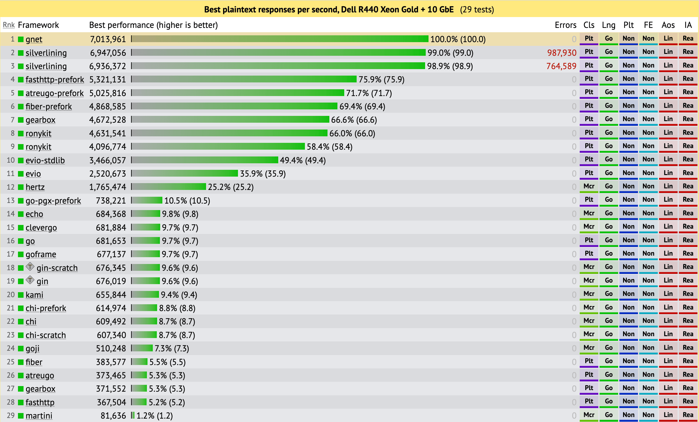 Note that the HTTP implementation of gnet on TechEmpower is half-baked and fine-tuned for benchmark purposes only and far from production-ready.