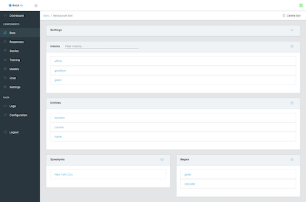 - UI for creating and managing training data - Examples, Intents, Entities, Synonyms, Regex, Stories, Actions, Responses