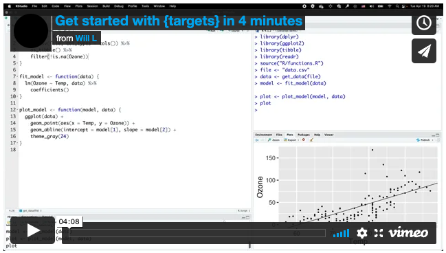 The 4-minute video at https://vimeo.com/700982360 demonstrates the example pipeline used in the walkthrough and functions chapters of the user manual. Visit https://github.com/wlandau/targets-four-minutes for the code and https://rstudio.cloud/project/3946303 to try out the code in a browser (no download or installation required).