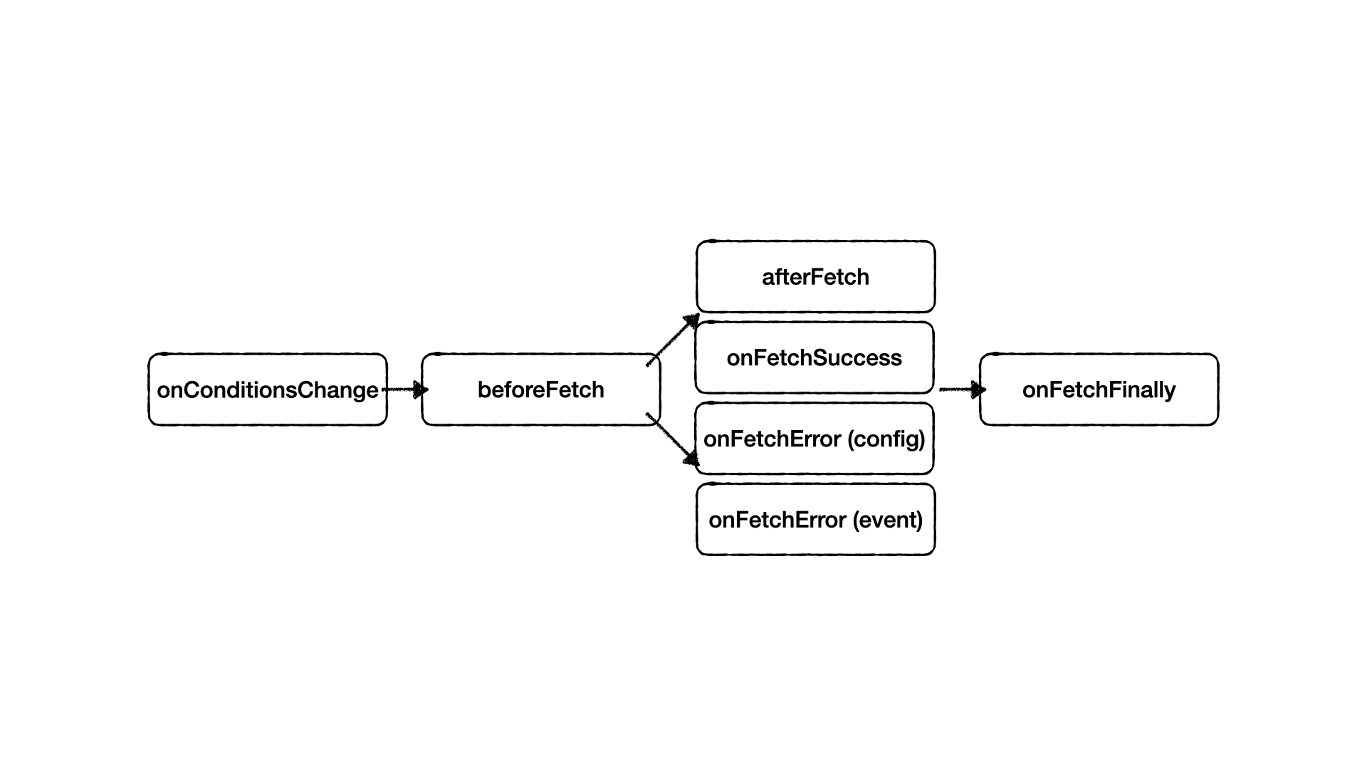const { data, onFetchSuccess } = useConditionWatcher({ fetcher, conditions, async afterFetch(response){ //response = { id: 1 } const detail = await fetchDataById(response.id) return detail // { id: 1, detail: 'xxx' } }) }) onFetchSuccess((response)=> { console.log(response) // { id: 1, detail: 'xxx' } })