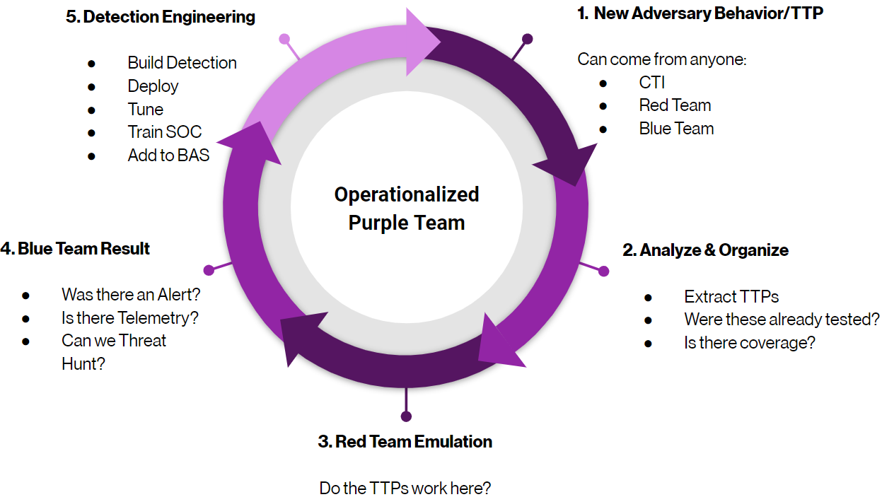 Purple Teaming can be operationalized with dedicated stakeholders from a variety of information security roles (CTI, Red, and Blue teams) working together as a virtual team. When new TTPs are discovered, they are analyzed, discussed, and emulated to continually build and improve detection and response. The process is illustrated below: