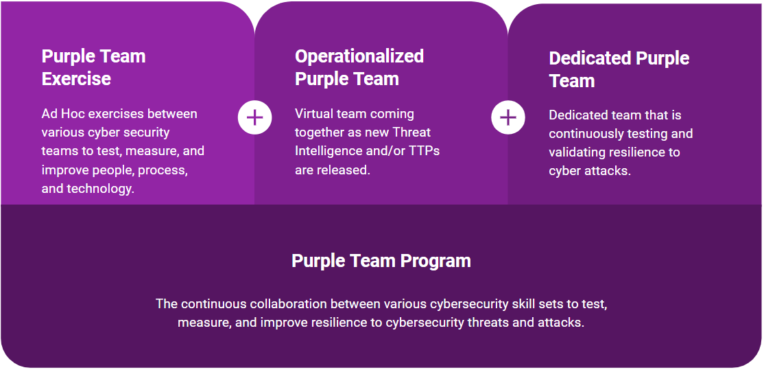 This document defines how to build and mature a Purple Team program from ad-hoc Purple Team Exercises, to Operationalized Purple Teaming, to building a Dedicated Purple Team. Purple Team Exercises are an efficient method to test, measure, and improve your organization's resilience to a real cyber attack. Purple Teaming focuses on fostering collaboration with your entire organization including people, process, and technology (security stack).