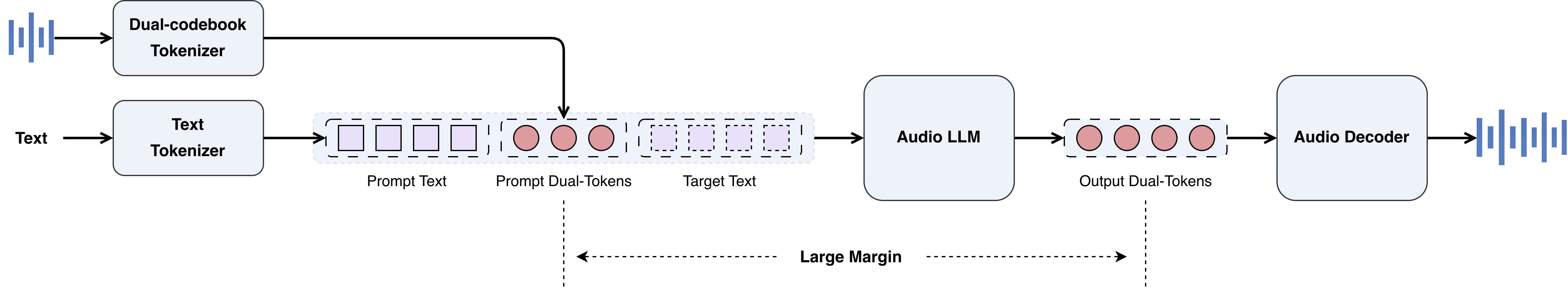 - An audio decoder, which converts the dual-codebook token sequences predicted by the audio LLM back into audio waveforms using a flow matching approach.