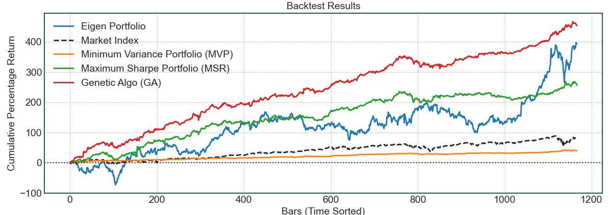 These results are from April 29th, 2020 to September 4th, 2020. The eigen portfolio performed the best but it also had a lot of volatility. Moreover, most of those returns are due to TSLA rocketing in the last few months. After that, our GA algorithm worked quite effectively as it beat the market index. Again, as expected, the MVP had the lowest risk and reward and slowly went up in 4-5 months. This shows the effectiveness and power of these algorithmic portfolio optimization strategies where we've developed different portfolios for different kinds of risk and reward profiles.