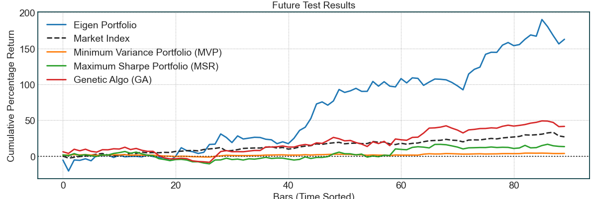 The backtests look pretty encouraging. The black dotted line is the market index i.e QQQ. Other lines are the strategies. Our custom genetic algorithm implementation seems to have the best backtest results because it's an advanced version of other strategies. The eigen portfolio that weighed TSLA the most have the most volatility but its profits are also very high. Finally, as expected, the MVP has the minimum variance and ultimately the least profits. However, since the variance is extremely low, it is a good portfolio for those who want to stay safe. The most interesting part comes next, let us look at the forward or future test results for these portfolios.