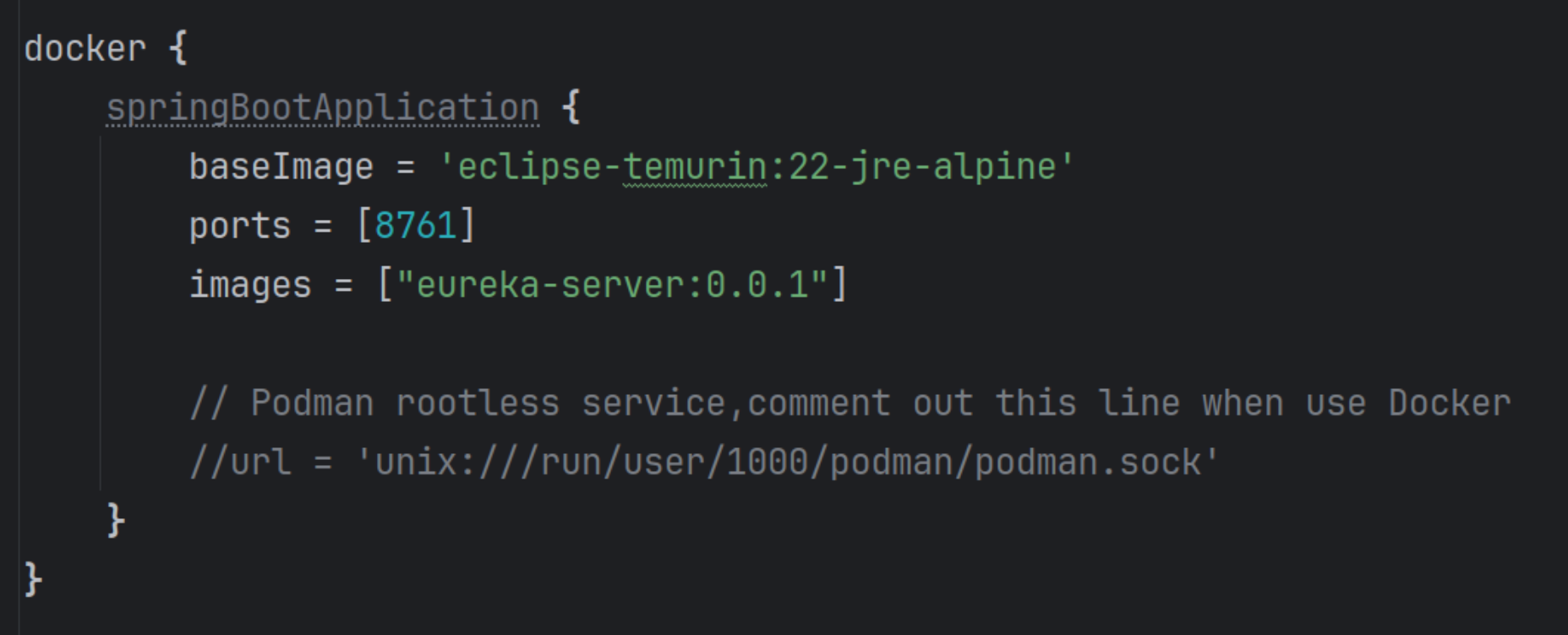 systemctl --user restart podmanBefore build image, comment out this line in build.gradle file :