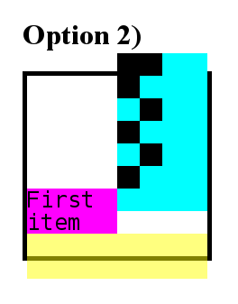 - 1st item (magenta): 50px height (with a 125px baseline offset), not overflowing the 2nd row.