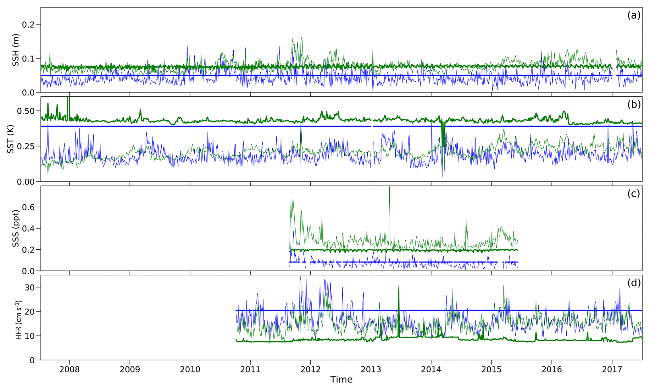 Figure 6Time series of spatially averaged background (blue) and observation (green) errors, with thick lines showing a priori values and thin lines the posterior calculated using Eqs. (5) and (7). (a) Sea surface height; (b) sea surface temperature; (c) sea surface salinity; and (d) HFR.
