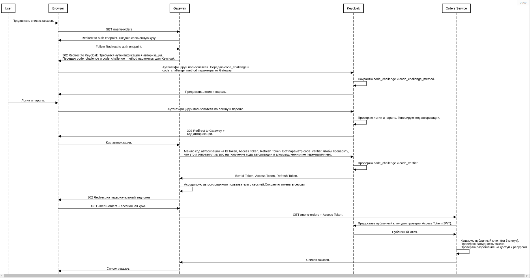 В этом случае серверами ресурсов будут выступать остальные микросервисы. Например Orders Service будет контролировать доступ к эндпоинту /v1/menu-orders как для метода POST(создание заказа), так и для метода GET(получение списка заказов пользователя). GET-запрос к эндпоинту /v1/menu-orders на получение информации о заказах от неавторизованного пользователя может выглядеть следующим образом (используется рекомендуемый подход с помощью кода авторизации + PKCE).