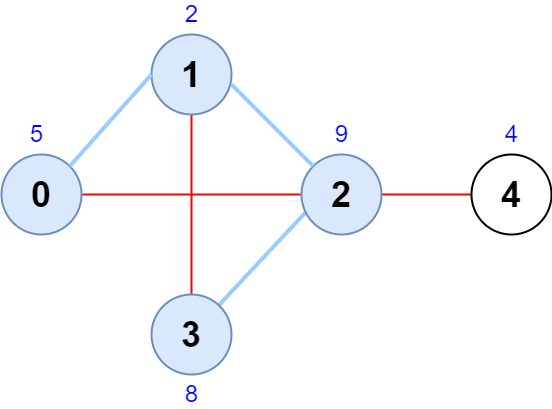n == scores.length4 <= n <= 5 * 1041 <= scores[i] <= 1080 <= edges.length <= 5 * 104edges[i].length == 20 <= ai, bi <= n - 1ai != bi- 不会有重边。