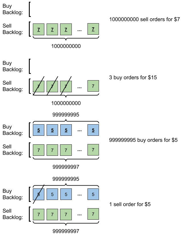 - 提交 999999995 笔采购订单,价格为 5 。销售订单的最低价为 7 ,所以这 999999995 笔订单添加到积压订单中。