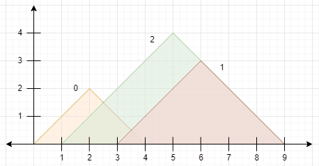 给定一个 下标从 0 开始 的二维整数数组 peaks,其中 peaks[i] = [xi, yi] 表示山 i 在坐标 (xi, yi) 处有一个峰值。山可以被描述为一个直角等腰三角形,它的底部沿着 x 轴,山峰处有一个直角。更正式地说,上山和下山的 梯度 分别为 1 和 -1。