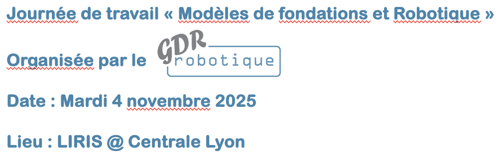 Le LIRIS accueillera la journée de travail « Modèles de fondations et Robotique » du GDR Robotique, le mardi 4 novembre 2025 sur le site de Centrale Lyon. L'appel à contributions est encore ouvert.