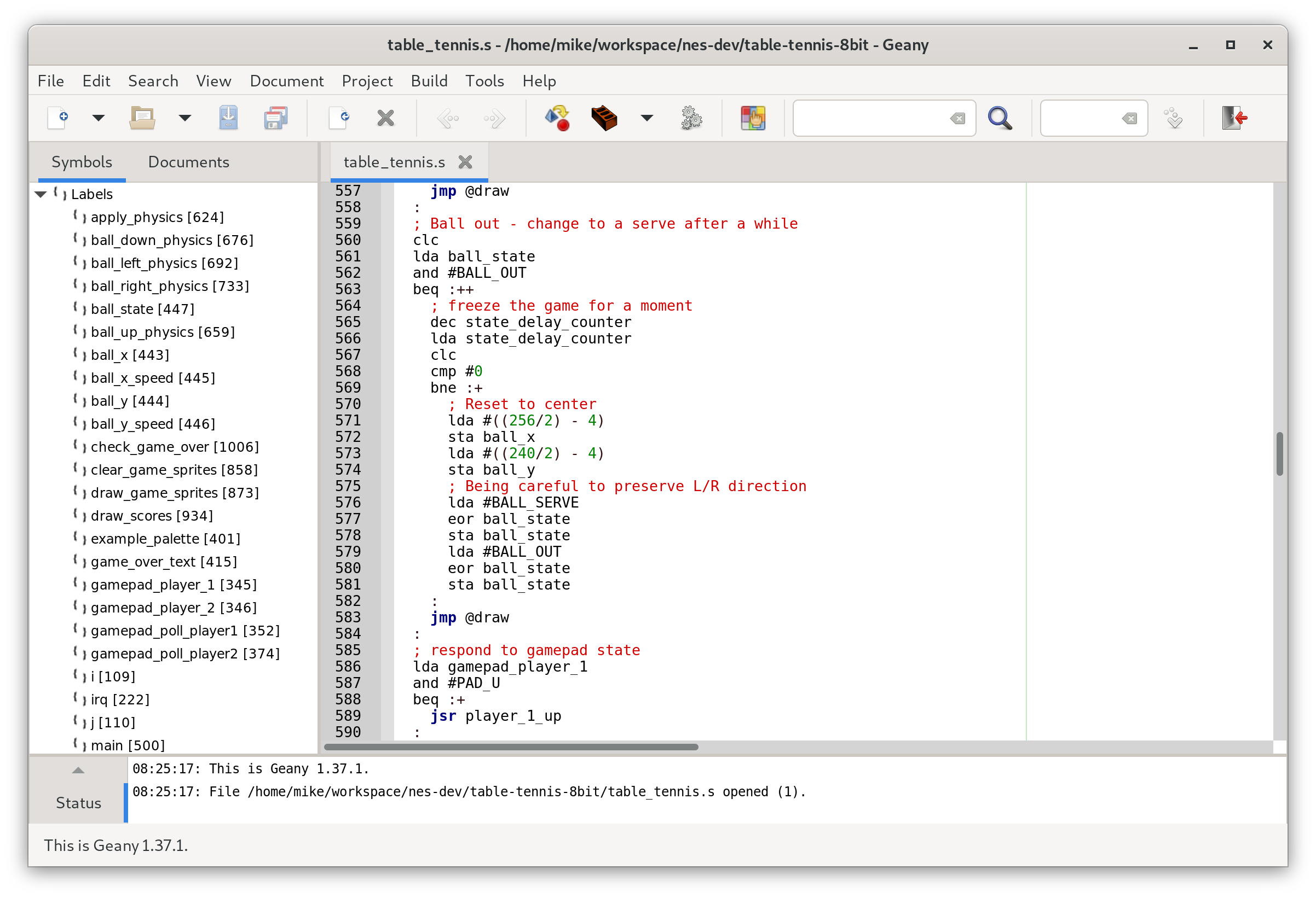 I wasn’t able to get it to recognise 6502 assembly, but it does have good x86 assembly (NASM) support, which is similar enough for it to allow navigation through the source code using labels.
