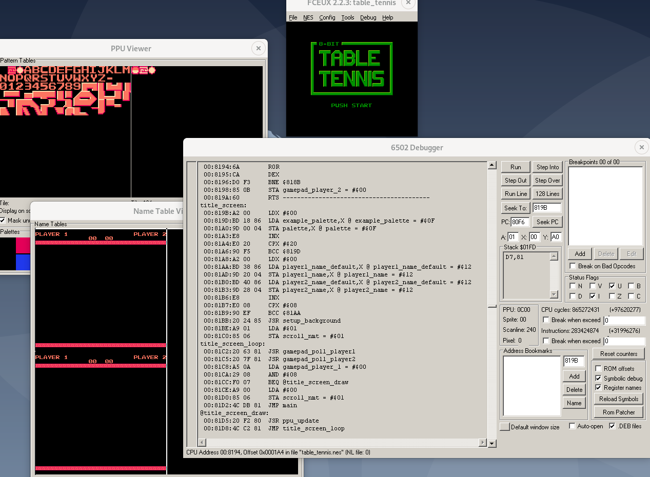 The CPU in the NES is a derivative of the once-ubiquitous MOS 6502, and games for it are mostly written in 6502 assembly. I already do a fair amount of programming, but quickly found that my usual editors, compilers and debuggers were useless for this platform.