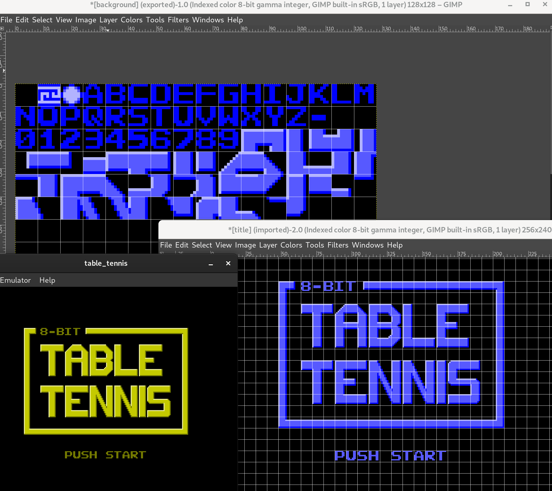 I created the graphics in the GNU Image Manipulation Program, and manually broke the title page down into tiles.