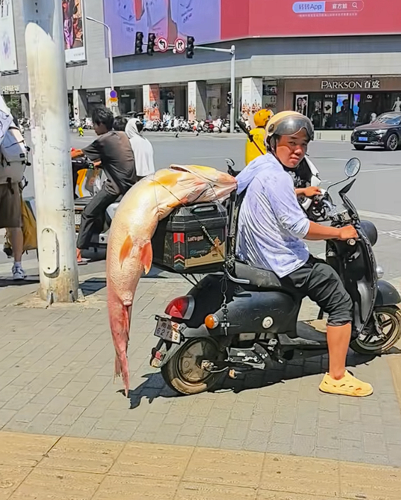 近日,江西南昌一网友发布视频显示,一男子钓到大鱼后,将其挂在电动车后座上,骑着车遛街,吸引了非常多的目光,而男子嘴角的笑容就没下去过。
