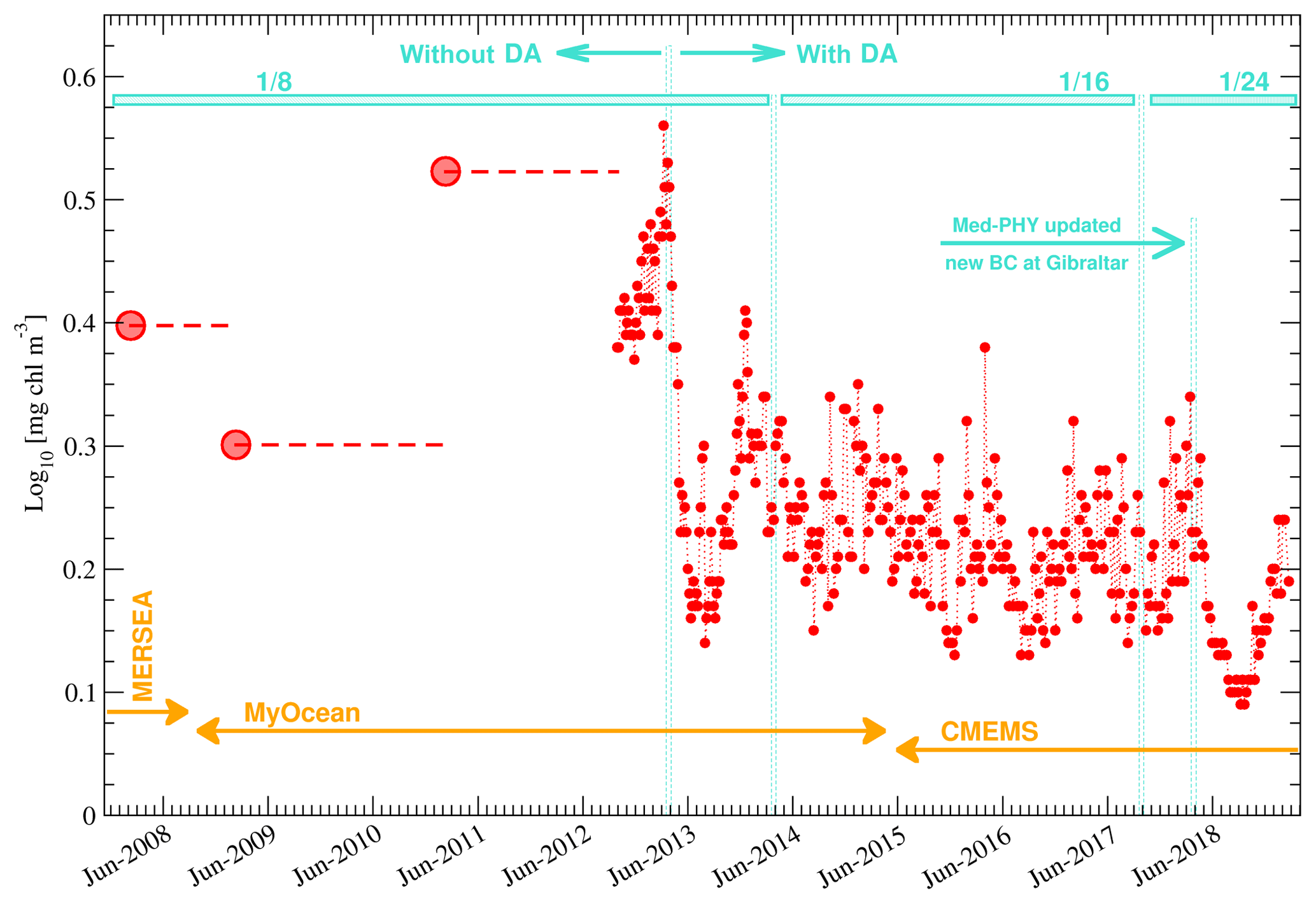 Assimilation of satellite surface chlorophyll concentration derived by the multi-sensor (MODIS and VIIRS) CMEMS product5 of ocean colour for the Mediterranean Sea is performed by 3DVarBio.