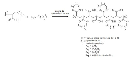 [0114] Exemplo 4. Comparativo de Desempenho de Perda de Fluido de Vários Produtos de Reação. Vários produtos de reação foram formados utilizando o procedimento de exemplo 1 ou uma variante modificada deste, omitindo compostos contendo amina conforme necessário para formar um produto de reação de uma composição desejada. O produto de reação foi, então, formulado em um fluido de tratamento tendo uma percentagem em peso definida a partir do produto de reação, conforme identificado na Tabela 1. A percentagem do polímero funcionalizado foi baseada na presunção de se completar a reação dos compostos contendo amina com os compostos de amida do polímero. Os fluidos de tratamento foram, então, aplicados a uma sedimentação de filtro BARACARB, tanto à temperatura ambiente (amostras A-G e J-M) ou à 170oF (amostras H e I), e a quantidade do fluido de tratamento eluído através da sedimentação de filtro ao longo de 10 minutos foi determinada. A recuperação de permeabilidade de salmoura de 2% de KCI foi determinada posteriormente, à mesma temperatura. Conforme mostrado na Tabela 1, vários polímeros de acrilamida e variantes hidrolisadas destes produtos de reação produzidos, os quais resultaram em um bom desempenho de perda de fluido ao longo de um intervalo de concentrações de produto de reação. Ademais, o desempenho de perda de fluido é ajustável, dependendo de quais os compostos contendo aminas estejam presentes. Tabela: 1 1poliacri lamida parcialmente hidrolisad a (BASF) 2copolímero de ácido acrílico/acrilamida acrílica modificada hidrofobicamente (BASF) 3copolímero de acrilamida e acrilato de t-butilo (Halliburton Energy Services) HDA = hexadecilamina AESA = ácido aminoetilsulfônico AEPA = ácido aminoetilfosfônico APIDAA = ácido aminopropiliminodiacético ACA = ácido aminocapróico[0114] Example 4. Comparison of Fluid Loss Performance of Various Reaction Products. Various reaction products were formed using the procedure of example 1 or a modified variant thereof, omitting amine-containing compounds as necessary to form a reaction product of a desired composition. The reaction product was then formulated into a treatment fluid having a defined weight percentage from the reaction product, as identified in Table 1. The percentage of functionalized polymer was based on the assumption of completion of reaction of the compounds containing amine with the amide compounds of the polymer. Treatment fluids were then applied to a BARACARB filter sedimentation, either at room temperature (AG and JM samples) or at 170oF (H and I samples), and the amount of treatment fluid eluted through the filter sedimentation at over 10 minutes was determined. The permeability recovery of 2% KCl brine was determined later at the same temperature. As shown in Table 1, various acrylamide polymers and hydrolyzed variants of these reaction products produced which resulted in good fluid loss performance over a range of reaction product concentrations. Furthermore, the fluid loss performance is adjustable depending on which amine-containing compounds are present. Table: 1 1Partially hydrolyzed polyacrylamide (BASF) 2Acrylic acid/hydrophobically modified acrylic acrylamide copolymer (BASF) 3Acrylamide t-butyl acrylate copolymer (Halliburton Energy Services) HDA = hexadecylamine AESA = aminoethylsulfonic acid AEPA = aminoethylphosphonic acid APIDAA = aminopropyliminodiacetic acid ACA = aminocaproic acid