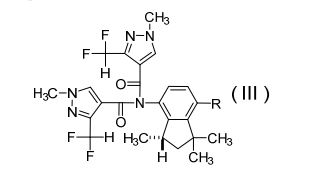 [0031] (R)-1,1,3-trimetil-4-aminoindano (0,20 g) (pureza óptica 96%), di-isopropiletilamina (1,2 mL), 4-dimetilaminopiridina (0,02 g), éter dimetílico de tetraetilenoglicol (5 mL) e cloreto de ácido 1-metil-3- difluorometilpirazol-4-carboxílico (0,46 g) foram misturados e a mistura resultante foi agitada a 80 °C durante 1 hora e depois agitada a 120 °C durante 5 horas. A mistura de reação foi resfriada à temperatura ambiente e depois foram adicionados água, tolueno e ácido clorídrico 5% para separar a mistura resultante.A camada orgânica resultante foi sequencialmente lavada com água, água saturada de bicarbonato de sódio e água, depois seca sobre sulfato de magnésio e concentrada sob pressão reduzida. Os resíduos resultantes foram submetidos à cromatografia em coluna de sílica gel para fornecer o seguinte composto (deste ponto em diante referido como o presente composto “(1)”) (pureza óptica 99,9%).[0031] (R)-1,1,3-trimethyl-4-aminoindan (0.20 g) (optical purity 96%), diisopropylethylamine (1.2 mL), 4-dimethylaminopyridine (0.02 g) , tetraethylene glycol dimethyl ether (5 mL) and 1-methyl-3-difluoromethylpyrazole-4-carboxylic acid chloride (0.46 g) were mixed and the resulting mixture was stirred at 80 °C for 1 hour and then stirred at 120 °C. °C for 5 hours. The reaction mixture was cooled to room temperature and then water, toluene and 5% hydrochloric acid were added to separate the resulting mixture. The resulting organic layer was sequentially washed with water, saturated sodium bicarbonate water and water, then dried over sulfate of magnesium and concentrated under reduced pressure. The resulting residues were subjected to silica gel column chromatography to provide the following compound (hereinafter referred to as the present compound “(1)”) (optical purity 99.9%).