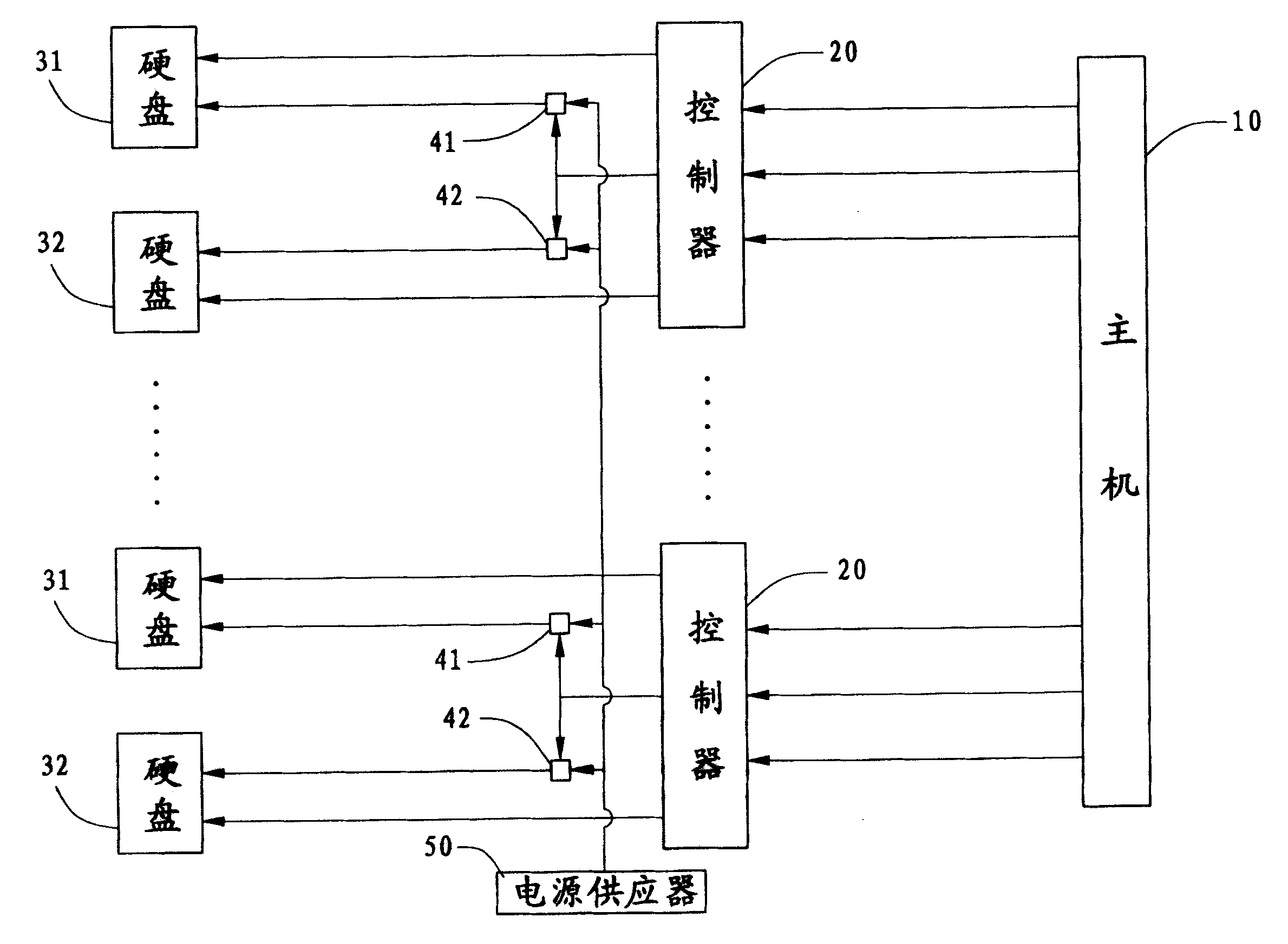 当获取一特定的ID数值n后,控制器20将执行步骤62,控制ID数值被分配为n的IDE硬盘装置延迟启动(m*n)秒。在连接有4个IDE接口,即4对IDE硬盘装置(1主IDE硬盘装置与1从属IDE硬盘装置为1对)的情况下,n取值从0到3,则每一IDE接口连接的一对IDE硬盘装置,启动时间依次间隔m秒。步骤63系由控制器20的QS控制,相应快速开关41、42同时开启,使得电源供应器50开始为IDE硬盘装置31、32供电,IDE硬盘装置31、32同时启动。按上述步骤,每对IDE硬盘装置31、32可分别完成启动。After obtaining a specific ID value n, the