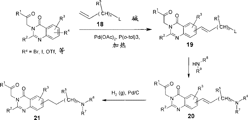 且X为0(如下面的8所示)。首先在有合适的酰胺键偶联试剂存在下使式2的邻氨基苯甲酸与式3的甘氨酰胺反应而得到偶联产物4。这类偶联试剂的一个实例可以为EDCI。单独或在有添加剂,诸如HOBt和合适的惰性溶剂,诸如二氯甲烷或DMF存在下加入偶联试剂。必要的邻氨基苯甲酸2和甘氨酸酰胺类3为商购的或易于通过本领域众所周知的操作步骤制备它们。可以通过在合适的溶剂,诸如乙醇中和升温,诸如回流状态下缩合亚氨酸盐5制备通式6的中间体喹唑啉类。然后用式7的醇,应用例如标准的Mitsonobu反应条件,即在有三苯膦和偶氮二羧酸二乙酯或DIAC存在下使游离羟基官能化,从而得到所需的产物8。And X is 0 (as shown in 8 below). First, anthranilic acid of formula 2 is reacted with glycinamide of formula 3 in the presence of a suitable amide bond coupling reagent to obtain coupling product 4. An example of such a coupling reagent would be EDCI. The coupling reagent is added alone or in the presence of an additive such as HOBt and a suitable inert solvent such as dichloromethane or DMF. The requisite anthranilic acid 2 and glycine amides 3 are either commercially available or they are readily prepared by procedures well known in the art. Intermediate quinazolines of general formula 6 can be prepared by condensing imidate 5 in a suitable solvent, such as ethanol, at elevated temperature, such as reflux. The free hydroxyl group is then functionalized with the alcohol of formula 7, using eg standard Mitsonobu reaction conditions, ie in the presence of triphenylphosphine and diethyl azodicarboxylate or DIAC, to give the desired product 8.