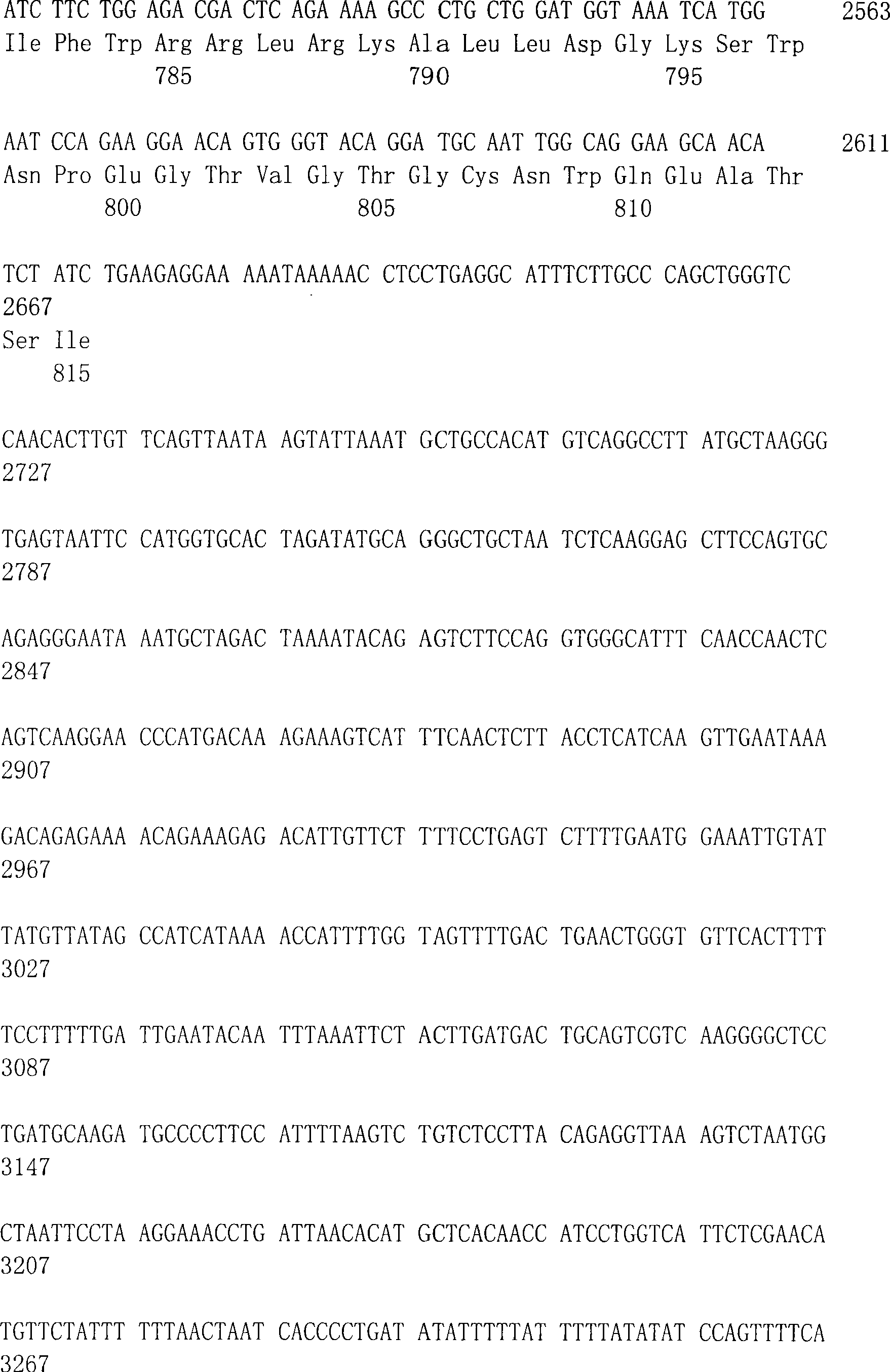 在其它实施方案中,本发明提供选自以下物质的组合物:大致纯的或重组的DTLR6蛋白或肽,它在至少大约12个氨基酸的长度内,表现出与SEQ ID NO:12的序列同一性至少为85%;SEQ ID NO:12的天然序列DTLR6;包含DTLR6序列的融合蛋白;大致纯的或重组的DTLR7蛋白或肽,它在至少大约12个氨基酸的长度内,表现出与SEQ ID NO:16或18的序列同一性至少为85%,或;SEQ ID NO:16或18的天然序列DTLR7;包含DTLR7序列的融合蛋白;大致纯的或重组的DTLR8蛋白或肽,它在至少大约12个氨基酸的长度内,表现出与SEQ ID NO:32的序列同一性至少为85%;SEQ ID NO:32的天然序列DTLR8;包含DTLR8序列的融合蛋白;大致纯的或重组的DTLR9蛋白或肽,它在至少大约12个氨基酸的长度内,表现出与SEQID NO:22的序列同一性至少为85%;SEQ ID NO:22的天然序列DTLR9;和包含DTLR9序列的融合蛋白;大致纯的或重组的DTLR10蛋白或肽,它在至少大约12个氨基酸的长度内,表现出与SEQ ID NO:34的序列同一性至少为85%;SEQ ID NO:34的天然序列DTLR10;和包含DTLR10序列的融合蛋白。In other embodiments, the invention provides compositions selected from the group consisting of substantially pure or recombinant DTLR6 proteins or peptides that exhibit sequence identity to SEQ ID NO: 12 over a length of at least about 12 amino acids at least 85% specific; the native sequence DTLR6 of SEQ ID NO: 12; a fusion protein comprising the sequence of DTLR6; a substantially pure or recombinant DTLR7 protein or peptide that exhibits the same identity as SEQ ID NO: 12 amino acids in length The sequence identity of NO: 16 or 18 is at least 85%, or; the native sequence DTLR7 of SEQ ID NO: 16 or 18; a fusion protein comprising a DTLR7 sequence; a substantially pure or recombinant DTLR8 protein or peptide, which is at least about Over a length of 12 amino acids, exhibiting at least 85% sequence identity to SEQ ID NO: 32; the native sequence DTLR8 of SEQ ID NO: 32; a fusion protein comprising the sequence of DTLR8; a substantially pure or recombinant DTLR9 protein or Peptides exhibiting at least 85% sequence identity to SEQ ID NO: 22 over a length of at least about 12 amino acids; the native sequence DTLR9 of SEQ ID NO: 22; and fusion proteins comprising the DTLR9 sequence; substantially pure or a recombinant DTLR10 protein or peptide exhibiting at least 85% sequence identity to SEQ ID NO: 34 over a length of at least about 12 amino acids; the native sequence DTLR10 of SEQ ID NO: 34; and comprising the DTLR10 sequence fusion protein.