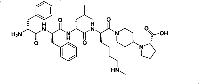 D-Phe and substituted D-Phe for the residue Xaa in formula I1Are examples of suitable amino acids. The phenyl ring may be substituted at any of the 2-, 3-and/or 4-positions. Specific examples of permissible substitutions include, for example, chlorine or fluorine at the 2-or 4-position. The alpha-carbon atom may also be methylated. Other equivalent residues representing conservative changes to D-Phe may also be used. These include D-Ala (cyclopentyl), D-Ala (thienyl), D-Tyr and D-Tic. Residue Xaa at the second position2It may also be D-Phe or substituted D-Phe with such substitutions, including substituents at the carbon at the 4-position or both the 3-and 4-positions of the phenyl ring. Alternatively, Xaa2May be D-Trp, D-Tyr or D-alanine substituted with naphthyl. Residue Xaa at the third position3Can be any non-polar amino acid residue, such as D-Nle, D-Leu, (alpha-Me) D-Leu, D-Hle, D-Met or D-Val. However, D-Ala (cyclopropyl, cyclobutyl, cyclopentyl or cyclohexyl) or D-Phe can likewise be used as Xaa3. Residue Xaa at the fourth position4May be any positively charged amino acid residue, for example D-Arg and D-Har optionally substituted with a lower alkyl group such as 1 or 2 ethyl groups. Alternatively, D-Nar and any other equivalent residues may be used, such as D-Lys or D-Orn (either of which may be omega-aminoalkylated, e.g., by methyl or isopropyl, or methylated on the alphacarbon group). Furthermore, D-Dbu, D-4-Amf (which may optionally be substituted with amidino) and D-Hlys are suitable amino acids at this position.