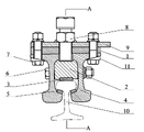 Embodiment 1: as Fig. 1, shown in Figure 2.Among the figure, 1 is clamping plate, and 2 is cushion block, and 3 are the industrial machinery upper friction plate, and 4 are the clamping rail, and 5 are industrial machinery friction lining down, and 6 is horizontal fastener, and 7 is vertical fastener, and 8 is jackscrew, and 9 is base-plate, and 10 is stock rail, 11 side's of being taper liner plates.Clamping plate 1, base-plate 9, clamping rail 4 is connected and fixed by vertical fastener 7.Jackscrew 8 passes clamping plate 1, the contact grooves of the base of base-plate 9 and clamping rail 4 and cushion block 2 upper surface corresponding positions, and fastening by nut.Cushion block 2 is installed in the centre of clamping rail 4.The web of the rail that horizontal fastener 6 passes cushion block 2 and clamping rail 4 is connected and fixed cushion block 2 and clamping rail 4.The banded draw-in groove of a sectional type is respectively arranged on 4 liang of relative lower jaw of rail head of lower surface and clamping rail surface of cushion block 2, every ribbon draw-in groove is divided into 3 draw-in grooves, friction lining 5 under mounting industrial machinery is used with upper friction plate 3 and industrial machinery respectively, industrial machinery is with the lower surface of outstanding cushion block after upper friction plate 3 compactings, and industrial machinery is with outstanding clamping rail rail head lower jaw surface after friction lining 5 compactings down.Industrial machinery all is ZP3-2 type asbestos friction sheet with upper friction plate 3 and industrial machinery with following friction lining 5.Jackscrew 8 compresses base-plate 9 from above, clamping plate 1, clamping rail 4 and cushion block 2, industrial machinery in the cushion block 2 lower surface draw-in grooves is pressed on the stock rail 10 with upper friction plate 3, laterally fastener 6 clamps from the web of the rail both sides of cushion block 2 and clamping rail 4, makes the industrial machinery on the relative lower jaw of clamping rail 4 rail heads surface press stock rail with following friction lining 5.Thereby industrial machinery compresses stock rail with following friction lining 5 from 3 faces with upper friction plate 3 and industrial machinery.The two ends of cushion block 2 are perpendicular.The upper surface of cushion block 2 has 2 grooves, is used to install jackscrew 8, and the middle part of cushion block 2 has 4 ellipse holes on the lower side, is used to install horizontal fastener 6.
