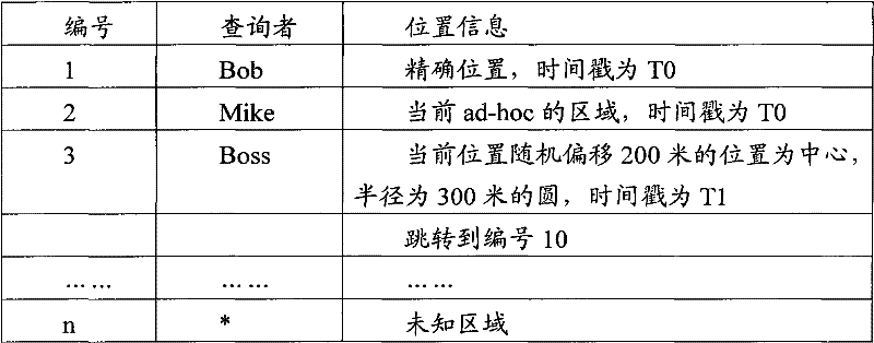 本发明实施例提供的技术方案的有益效果是:通过在节点上预先定义用户精度控制表,实现了在节点级别针对不同查询者返回不同精度的位置信息,可提供多个精度的位置服务,从而增强了节点的位置隐私性。The beneficial effect of the technical solution provided by the embodiment of the present invention is: by pre-defining the user precision control table on the node, the location information of different precisions can be returned to different inquirers at the node level, and multiple precision location services can be provided, thereby The location privacy of nodes is enhanced.