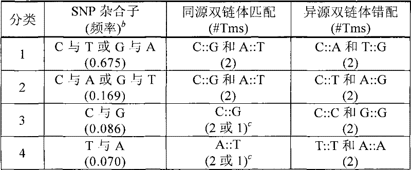 The DNA of heterozygosis is made up of 4 kinds of different strands, and these strands can produce 2 kinds of homoduplex molecules and 2 kinds of heteroduplex molecules in sex change and when cooling off.In theory, all 4 kinds of products to have different Tm values and melting curve should be all 4 kinds of two strandss to strand change synthetic.Yet, the double-stranded specific DNA dyestuff possibly in separating chain process, redistribute (Aktipis S etc., Biochemistry 1975; 14:326-31), this causes that dyestuff also is distributed on the homoduplex molecule of higher melting temperature(Tm) from the heteroduplex molecule release of low melting temperature(Tm) again.Because that SYBR under the concentration compatible with PCR