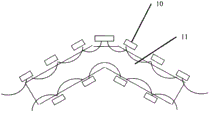 The bending magnetic filtration channel of band shaped plasma magnetic filters the magnetic field of use, also can apply by permanent magnet, Fig. 4 has provided the bending magnetic filtration channel of knee shape band shaped plasma and has has extremely mutually connected and composed from beginning to end by the N utmost point and the S of permanent magnet 10 example that myopia is parallel to the cusped magnetic field 11 of the bending magnetic filtration channel of knee shape band shaped plasma inwall.This cusped magnetic field 11 also can prevent the diffusion to tube wall of charged particle in the band shaped plasma of admission passage in the direction of tube wall, and plasma body is sent to coating chamber (not providing in figure).