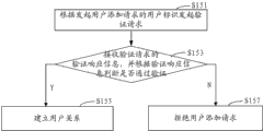 In the present embodiment, 150 pairs of authentication modules are initiated users and are added requesting users and verify and obtain verifying the result, judge that whether the checking result is that checking is passed through, if then the notice relation is set up module 170 and set up customer relationship, if not, then finishes.