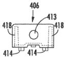 Figure 40 A to Figure 40 D illustrates the various views for the exemplary track 412 of the optical fiber case 408 of Figure 38.In one embodiment, track 412 has three section 412-1,412-2, the 412-3 that is formed by two grooving 415-1,415-2.Grooving 415-1,415-2 are used for optical fiber module or box are locked in track 412, such as hereinafter more detailed discussion.Track 412 also can have a pair of bolt-lock 419-1, and described bolt-lock 419-1 can extend from section 412-2 in one embodiment, illustrated in Figure 40 A to Figure 40 D.Track 412 can have groove 417 in the end of section 412-1.Track 412 also can have bolt-lock 419-2 in an end of track 412, for example in the end of part 412-3, illustrated in Figure 40 A to Figure 40 D.Bolt-lock 419-1,419-2 can be used for track 412 is attached to the optical fiber case 374 of Figure 35 A and Figure 36 B, or the optical fiber case 408 of Figure 38.In one embodiment, bolt-lock 419-1,419-2 can be engaged in the collector 383 in the base 382 of the optical fiber case 374 that is placed in Figure 35 A and Figure 36 B and can be used for track 412 is attached to optical fiber case 374.Bolt-lock 419-1,419-2 can be flexible and flexible, so that bolt-lock 419-1,419-2 produce deflection to allow bolt-lock 419-1,419-2 to extend in the collector 383 track 412 is fixed to the base 382 of the optical fiber case 374 of Figure 35 A and Figure 36 B.Figure 41 A and Figure 41 B are respectively exemplary optics fibre module on the track that can be installed in the optical fiber case 408 of Figure 38 or front perspective view and the side view of box 422.As illustrated in the front perspective view and top view of the optical fiber module/box 422 among Figure 41 A and Figure 41 B, optical fiber module/box 422 comprises case 422H respectively, and described case 422H comprises the first terminal 422-1 and the second terminal 422-2.Track guide 421A, 421B are placed in respectively in case 422H on the first terminal 422-1 and the second terminal 422-2 of case 422H.Therefore, when the rear portion 422R of optical fiber module/box 422 was inserted on the track 412 that is placed on the optical fiber case 408, track guide 421A, the 421B of optical fiber module/box 422 aimed at track 412.Track guide 421A, 421B take in track 412.Optical fiber module/box 422 can slide from the anterior 408F of optical fiber case 408 get back to rear portion 408R(Figure 38 of optical fiber case 408), until the front side 422F of optical fiber module/box 422 on track 412 grooving 415-1 or the one among the 415-2 in lock onto the appropriate location.