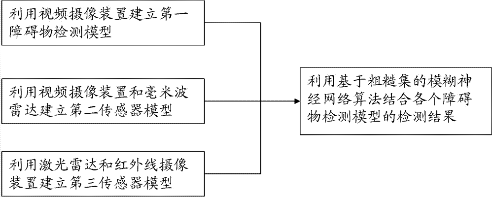 为实现上述目标,本发明提供了一种用于检测目标区域中的道路障碍物的方法,其特征在于,所述方法包括以下步骤:利用视频摄像装置获取所述目标区域的视频图像信息;基于所述视频图像信息建立第一障碍物检测模型;利用毫米波雷达获取所述目标区域的第一位置信息;基于所述视频图像信息和所述第一位置信息建立第二障碍物检测模型;利用激光雷达所述目标区域的第二位置信息并且利用红外线摄像装置获取所述目标区域的温度信息;基于所述第二位置信息和所述温度信息建立第三障碍物检测模型;以及利用基于粗糙(vague)集的模糊神经网络算法结合所述第一障碍物检测模型的检测结果、所述第二障碍物检测模型的检测结果和所述第三障碍物检测模型的检测结果以确定所述道路障碍物的特征信息,其中,所述目标区域被划分成一系列三维立体栅格,并且所述第一、第二和第三障碍物检测模型的检测结果均包括表征每个所述三维立体栅格是否被所述道路障碍物占据的栅格信息。 In order to achieve the above goals, the present invention provides a method for detecting road obstacles in a target area, characterized in that the method includes the following steps: using a video camera device to obtain video image information of the target area; Establishing a first obstacle detection model based on the video image information; acquiring first position information of the target area by using millimeter-wave radar; establishing a second obstacle detection model based on the video image information and the first position information; using The second position information of the target area of the laser radar and the temperature information of the target area obtained by using an infrared camera; the third obstacle detection model is established based on the second position information and the temperature information; The fuzzy neural network algorithm of the vague) set combines the detection results of the first obstacle detection model, the detection results of the second obstacle detection model and the detection results of the third obstacle detection model to determine the road obstacles feature information of objects, wherein the target area is divided into a series of three-dimensional grids, and the detection results of the first, second and third obstacle detection models all include whether each of the three-dimensional grids Grid information occupied by road obstacles.