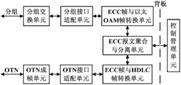 ECC message convergence and separative element are used for: the ECC message that the ECC message that packet side is sent and OTN side are sent mixes, and is sent to the control and management unit; From the code stream of backboard side serial, recover ethernet frame, and carry out relevant FCS(Frame Check Sequence, frame check field) checking treatment; According to the ECC frame format of OTN and the ECC frame format of grouping the ECC message is separated respectively, the ECC message of OTN is sent to OTN becomes frame unit, the ECC message of grouping is sent to packet switch unit.
