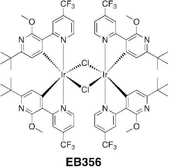 普遍接受的是FIrpic络合物的不稳定性可能归因于以下原因:(1)氟与芳香族碳的键稳定性差,并且(2)两个氟原子之间的质子由于这两个氟原子的强烈受体特征而变为高酸性的。因为这两个原因都直接与氟原子的存在相关,所以高度寻求的是通过更稳定的取代基来替换这些取代基而同时保持高的发光性和可加工性的解决方案。然而,迄今为止,进行的主要研究是针对选择与FIrPic中使用的苯基-吡啶不同的主要配体。这种途径预期会与广泛研究并且优化的FIrPic相比在根本上修饰磷光掺杂剂的电化学和光物理特性。It is generally accepted that the instability of the FIrpic complex may be attributed to the following reasons: (1) the poor bond stability of fluorine to the aromatic carbon, and (2) the proton between the two fluorine atoms due to the strong receptor characteristics and become highly acidic. Since both of these reasons are directly related to the presence of fluorine atoms, a solution to replace these substituents by more stable substituents while maintaining high luminescence and processability is highly sought. However, to date, the main studies performed have been directed towards the selection of primary ligands different from the phenyl-pyridine used in FIrPic. This approach is expected to fundamentally modify the electrochemical and photophysical properties of phosphorescent dopants compared to the extensively studied and optimized FIrPic.
