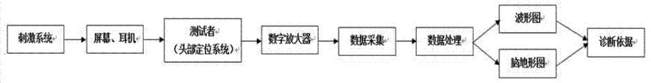 Eeg amplifier gathers tested original eeg data by the interface being connected with head location system, and convert these original analog to digital signal, synchronize with the stimulation mark triggers signal receiving through 25 pin parallel ports after amplifying and export to USB interface, by USB interface, be transferred to the computer that is solidified with data acquisition unit and data processing unit and record and analyze.