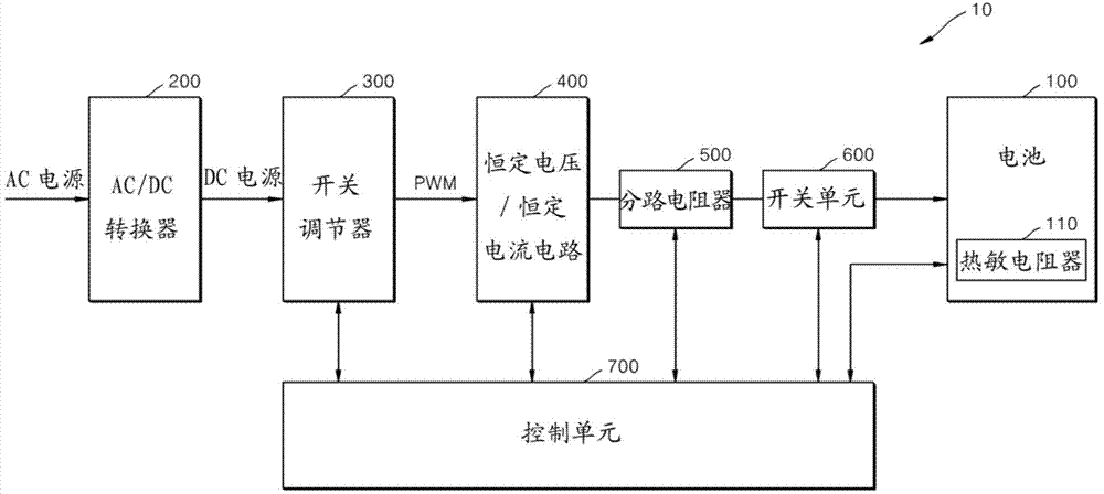 控制单元700通过控制开关调节器300、恒定电压/恒定电流电路400、分路电阻器500、以及开关单元600的操作来控制电池100的恒定电流充电步骤和恒定电压充电步骤。控制单元700可以通过输出用于改变开关调节器300的占空比的信号来控制输出电压,并且可以通过使用由分路电阻器500检测的电压/电流来控制恒定电压/恒定电流电路400的输出电压/电流。并且,控制单元700可以通过使用由分路电阻器500检测的电压/电流来控制开关单元600的操作。此外,控制单元700可以通过使用包括在电池100中的热敏电阻器110的输出信号来感测电池100的温度,从而进行控制以停止和重新开始电池100的充电操作。在一些实施例中,热敏电阻器110可以形成在电池100外部。The