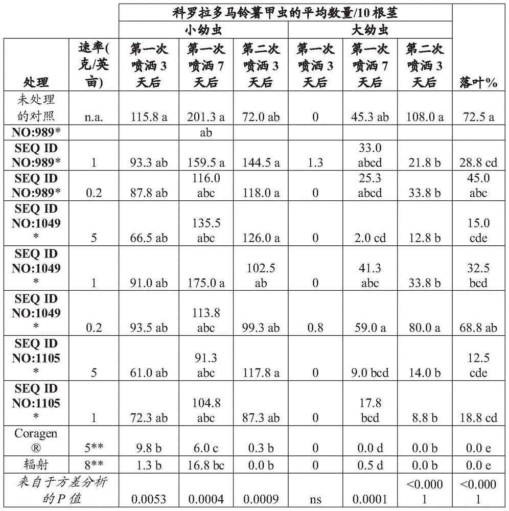 (Spinetoram, Dow Agrosciences). The results are presented in table 7; statistically different values are indicated by different letters (a, b, c, d, e). Those treatments that share one letter, such as untreated controls that share the letter "a" and 5 grams/acre of SEQ ID NO: 989 treatment had no statistical differences; those treatments not sharing a letter, e.g. untreated control and 3 days after the first spray