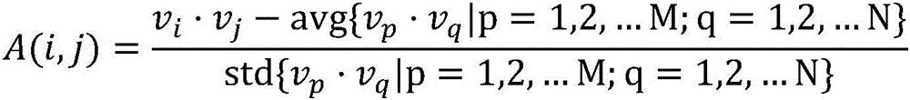 其中,vi表示货架图像上的某SIFT特征点i的标准化描述向量,vj表示模板图像商标区域内的某SIFT特征点j的标准化描述向量,vi·vj表示两向量点积,avg表示求平均值,std表示求标准差,M表示货架图像上特征点总数,N表示模板图像商标区域内特征点总数,avg{vp·vq|p=1,2,…M;q=1,2,…N}表示货架图像上的SIFT特征点与模板图像商标区域内的SIFT特征点的所有配对情况的标准化描述向量点积的平均值,std{vp·vq|p=1,2,…M;q=1,2,…N}表示货架图像上的SIFT特征点与模板图像商标区域内的SIFT特征点的所有配对情况的标准化描述向量点积的标准差;Among them, v i represents the standardized description vector of a SIFT feature point i on the shelf image, v j represents the standardized description vector of a SIFT feature point j in the trademark area of the template image, v i ·v j represents the dot product of two vectors, avg Represents the average value, std represents the standard deviation, M represents the total number of feature points on the shelf image, N represents the total number of feature points in the template image trademark area, avg{v p ·v q |p=1,2,...M; q= 1,2,...N} represents the average value of the standardized description vector dot product of all pairs of SIFT feature points on the shelf image and SIFT feature points in the template image trademark area, std{v p ·v q |p=1 ,2,...M; q=1,2,...N} represents the standard deviation of the standardized description vector dot product of all pairs of SIFT feature points on the shelf image and SIFT feature points in the template image trademark area;