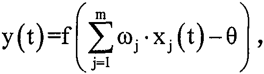 其中,mod为求余函数,f( )函数取为sigmoid函数;xck(t)为承接层输出,xj(t)为隐含层输出,ui(t-1)和y(t)分别为输入层输入和输出层输出,ωj、ωjk和ωji分别为隐含层到输出层的连接权值、承接层到隐含层的连接权值和输入层到隐含层的连接权值,θ和θj分别为输出层和隐含层阈值;k=1,2...m,q为所选定的回归延时尺度,根据采样周期和下料速率优选,如可选q=5;j==1,2...m,i=1,2...5。Among them, mod is the remainder function, f( ) function is taken as the sigmoid function; xc k (t) is the output of the successor layer, x j (t) is the output of the hidden layer, u i (t-1) and y(t) are the input layer input and the output layer output, respectively, ω j , ω jk and ω ji are the connection weights from the hidden layer to the output layer, the connection weights from the successor layer to the hidden layer, and the connection from the input layer to the hidden layer, respectively Weights, θ and θ j are the thresholds of the output layer and the hidden layer respectively; k=1, 2...m, q is the selected regression delay scale, which is preferred according to the sampling period and cutting rate, such as optional q=5; j==1, 2...m, i=1, 2...5.
