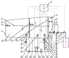 1. A fuel tank fuel delivery and consumption simulation system comprises a fuel tank (1) and a measurement and control system (5) for detection, wherein oil in the fuel tank (1) is delivered into a fuel depot (14) for simulation test; the method is characterized in that: the oil tank (1) is internally divided into three independent chambers, namely a first measuring and calculating unit (34), a second measuring and calculating unit (35) and a third measuring and calculating unit (36) through a partition plate (33) arranged inside; wherein the third evaluation unit (36) is connected to the second evaluation unit (35) via a second oil line (28); the second measuring and calculating unit (35) is communicated with the first measuring and calculating unit (34) through the first oil conveying pipeline (21); the first measuring and calculating unit (34) is communicated with the oil depot (14) through an oil consumption pipeline (13).