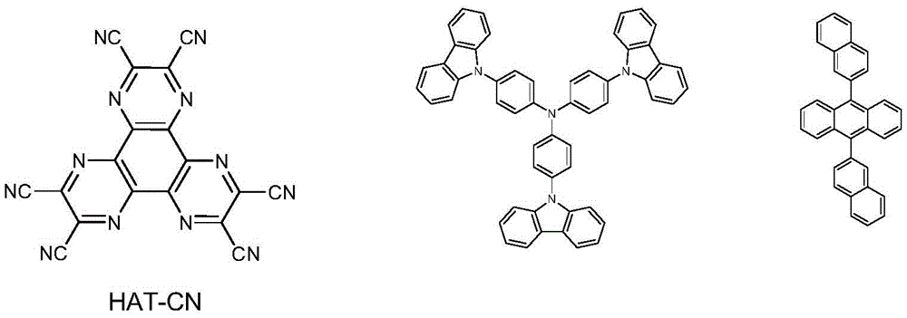 And 2, performing vacuum thermal deposition or spin coating on the surface of the anode by using a conventional method to obtain a hole injection layer material (HIL), wherein the hole injection layer material can be CuPc, m-MTDATA, m-MTDAPB, TCTA of star amines, 2-TNATA or IDE406 commercially available from Nippon Kyowa Co.