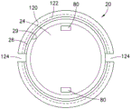 According to another exemplary implementation of the embodiment of the present disclosure shown in the example of fig. 3B, the retention interface for securing the outer housing 20 relative to the inner housing 30 may be implemented, for example, as follows. The outer surface 39 of the sidewall 36 of the inner housing 30 may include an inner housing retention feature, such as a protrusion (or skirt or flange) 110, and the inner surface 29 of the sidewall 26 of the outer housing 20 may include an outer housing retention feature, such as a recess 120. Protrusion 110 and recess 120 are configured to engage, for example, at respective first contact surfaces 112 of protrusion 110 and second contact surfaces 122 of recess 120, such that outer housing 20 is secured to inner housing 30 while allowing rotational movement of outer housing 20 relative to inner housing 30, such as shown with respect to the example of fig. 5 and 6.