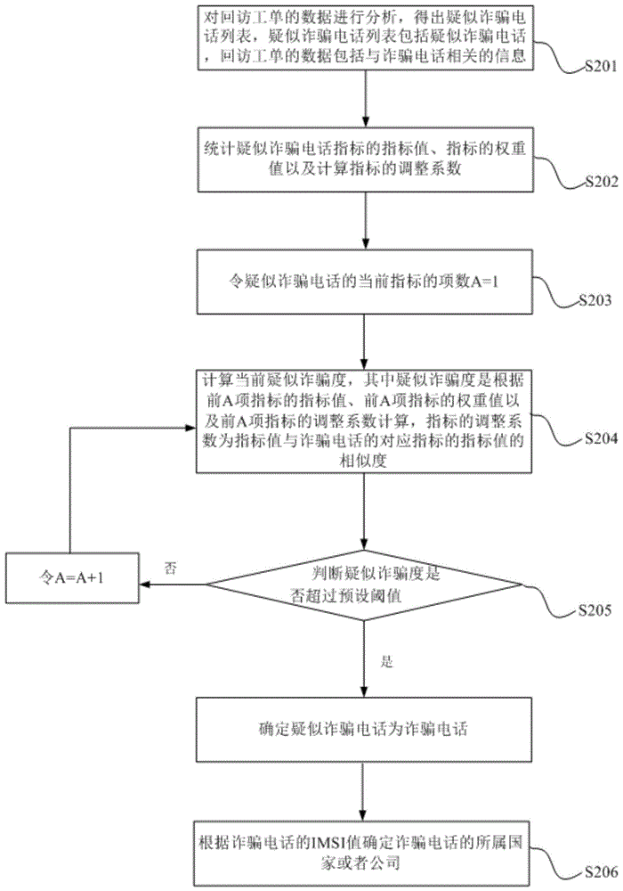 s201, analyzing the data of the return visit work order to obtain a suspected fraud phone list, wherein the suspected fraud phone list comprises suspected fraud phones, and the data of the return visit work order comprises information related to the fraud phones.