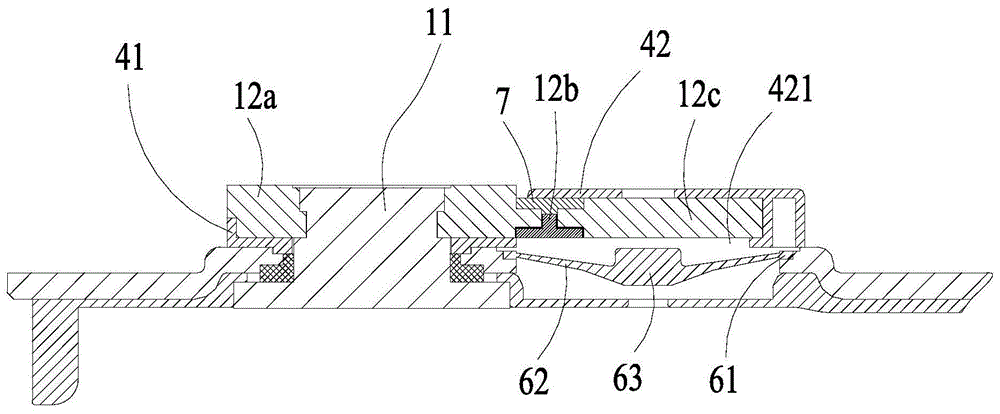 In this application, the top cap assembly 1 further includes a thermal expansion portion 7, the thermal expansion portion 7 is made of an insulating material that expands when heated, as shown in fig. 4, the first fuse member 12b and the thermal expansion portion 7 are arranged along the thickness direction of the conductive member 12, the thermal expansion portion 7 is located above the first fuse member 12b, and the thermal expansion portion 7 is attached to the post connection portion 12a and the contact piece connection portion 12c, respectively. When the heat is applied, the thermal expansion portion 7 expands and deforms, and the contact piece connecting portion 12c is displaced to the side away from the post connecting portion 12a by the expansion force of the thermal expansion portion 7, and at this time, a gap is generated between the post connecting portion 12a and the contact piece connecting portion 12c, and the gap can provide a flow path for the melted first fusing member 12b, so that the first fusing member 12b flows out along the flow path, and thus, the electrical connection loop between the post connecting portion 12a and the contact piece connecting portion 12c is reliably broken.