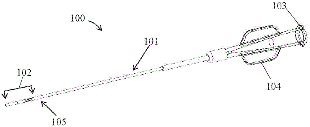 Fig. 1 shows an exemplary embolic microcatheter 100 comprising an elongate body 101 and a microcatheter head 102. The elongate microcatheter body 101 may be connected at its proximal end 103 to a suspension reservoir (optionally via a luer taper type fitting 104) and configured for passage of a pre-made suspension comprising embolic particles suspended in a suspension fluid therethrough.